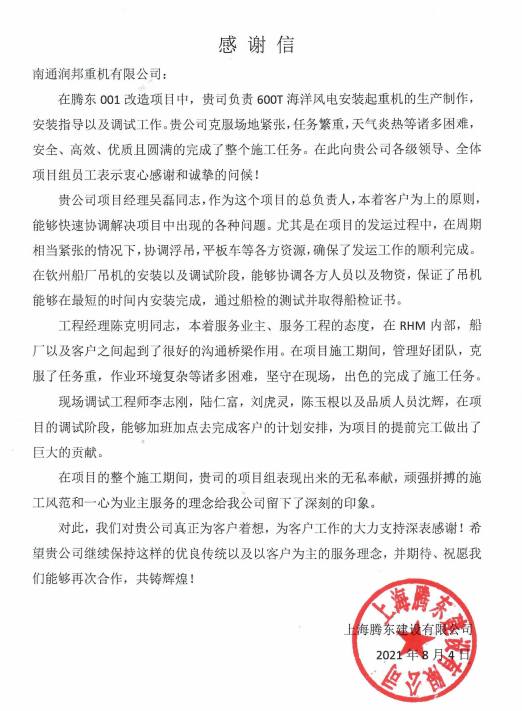 近日,子公司潤(rùn)邦重機(jī)收到一封來(lái)自上海騰東建設(shè)有限公司的感謝信。騰東公司在信中對(duì)GENMA項(xiàng)目團(tuán)隊(duì)無(wú)私奉獻(xiàn)、頑強(qiáng)拼搏的施工風(fēng)范和客戶至上的服務(wù)理念給予了高度肯定和表?yè)P(yáng)。 “騰東001”是一座專業(yè)用于海上風(fēng)電安裝的作業(yè)平臺(tái)。潤(rùn)邦重機(jī)為該項(xiàng)目提供了一臺(tái)GENMA 600噸全回轉(zhuǎn)海洋起重機(jī),同時(shí)為該設(shè)備的安裝指導(dǎo)和調(diào)試工作提供了全面的技術(shù)支持。在項(xiàng)目施工過程中,潤(rùn)邦重機(jī)項(xiàng)目團(tuán)隊(duì)克服了場(chǎng)地緊張、任務(wù)繁重、天氣炎熱等困難,最終安全、高效、優(yōu)質(zhì)且圓滿的完成了整個(gè)施工任務(wù)。