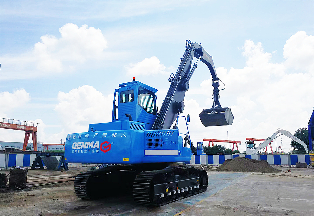 由潤邦重機自主研發制造的兩臺GENMA 42噸履帶式全液壓抓料機在河北唐山客戶現場正式交付。