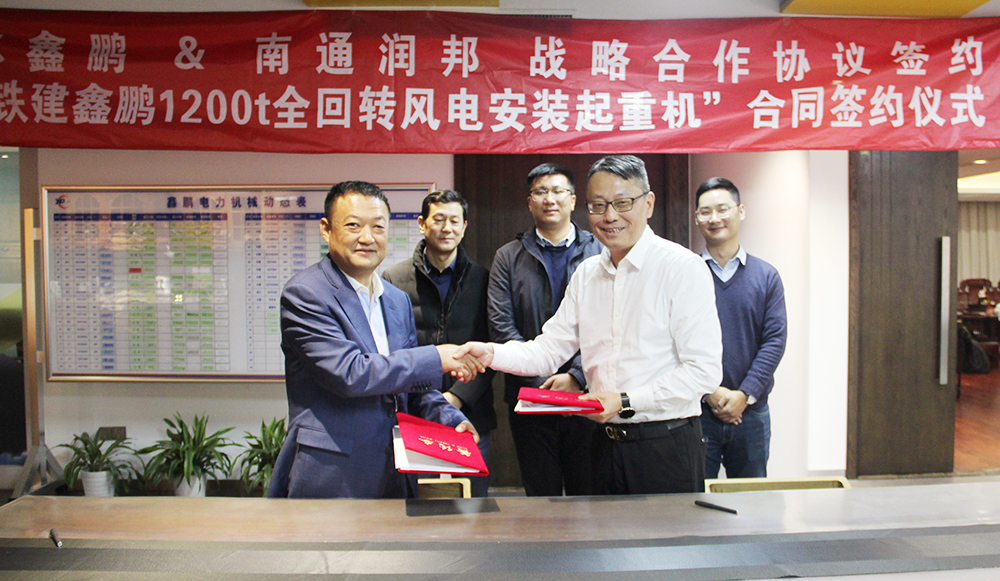 近日,潤邦重機與江蘇鑫鵬電力工程有限公司(簡稱:鑫鵬電力)正式簽訂了一臺GENMA 1200噸全回轉海洋起重機(簡稱:GENMA海洋起重機)訂單合同,該訂單產品將用于海上風電未來15兆瓦大功率風機的吊裝作業。