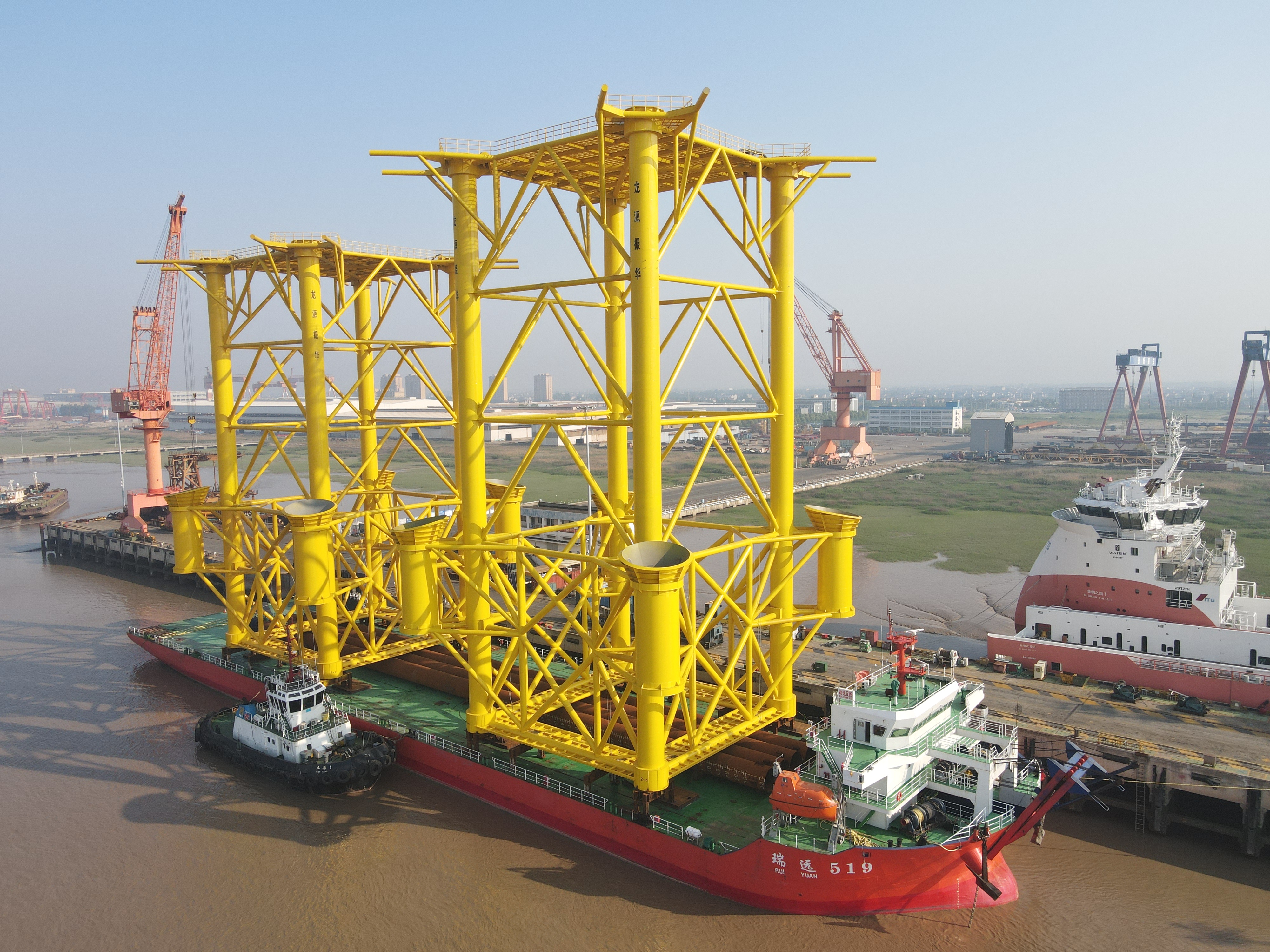 近日,子公司潤邦海洋為客戶建造的廣東青州海上風電項目兩套沉樁導向架完美交付。此次建造的海上沉樁導向架,主要用于導管架定位樁的安裝。導向架重量分別為950噸、975噸,高度分別為51.5米、56.5米,為我公司承接的首例同類產品。