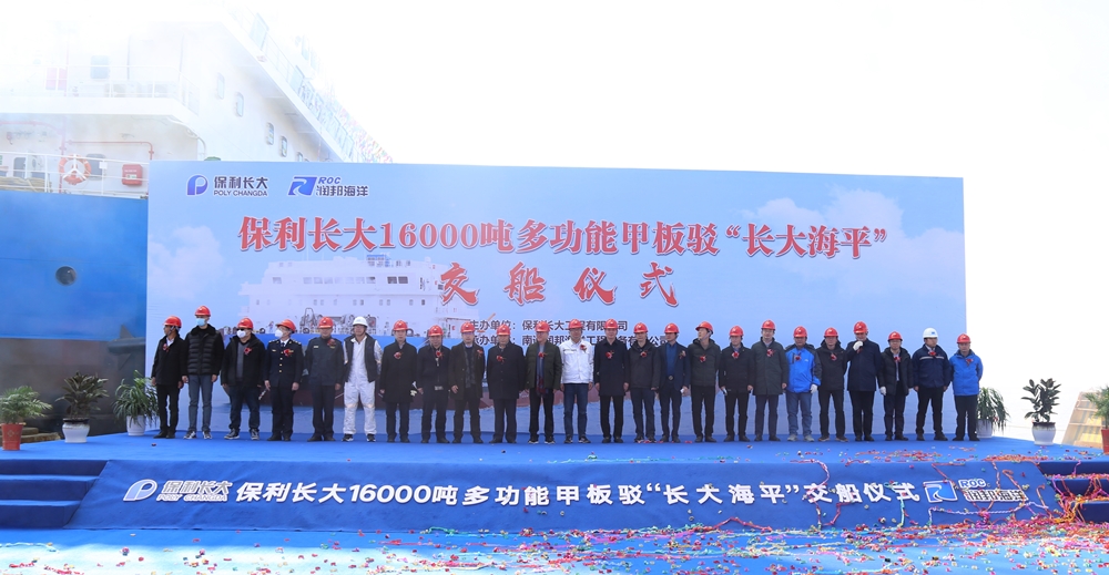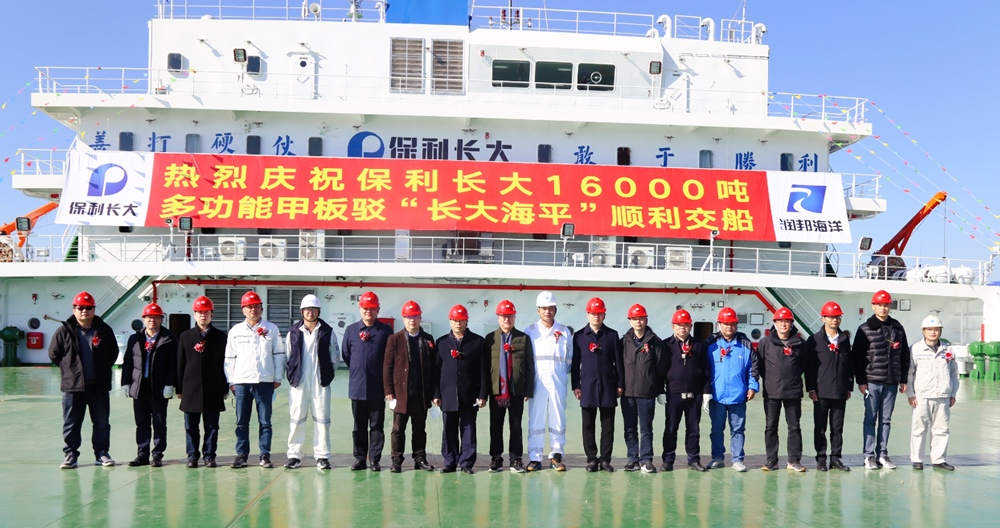 近日,子公司潤邦海洋為保利長大工程有限公司建造的16,000噸多功能甲板駁“長大海平”在潤邦海洋碼頭隆重舉行交船儀式。保利長大工程有限公司副總經理楊建文先生、機材部副總經理曹颋熠先生,港航公司黨總支書記李斌先生,啟東海工船舶工業園區領導,中國船級社陳繼恩先生,潤邦海洋執行董事施曉越先生、潤邦海洋總經理邵夕吾先生等出席。