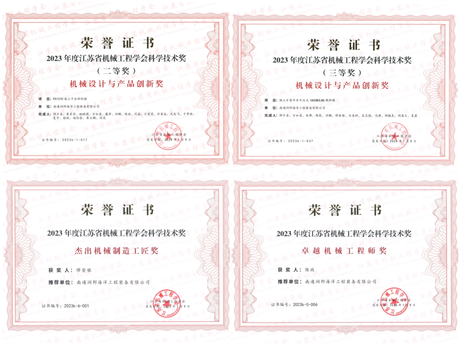 近期,子公司潤邦海洋喜獲江蘇省機械工程學(xué)會頒發(fā)的四項榮譽證書,其中“PX121H海上平臺供給船”項目榮獲“機械設(shè)計與產(chǎn)品創(chuàng)新獎二等獎”,“獨立C型半冷半壓式1800M3LNG燃料罐”項目榮獲“機械設(shè)計與產(chǎn)品創(chuàng)新獎三等獎”;生產(chǎn)部繆登銀榮獲“杰出機械制造工匠獎”,設(shè)計部陳政榮獲“卓越機械工程師獎”。此次獲獎的研究成果不僅得到了同行專家們的充分肯定,也體現(xiàn)了潤邦海洋創(chuàng)新力度不斷增強、創(chuàng)新質(zhì)量逐步提升。