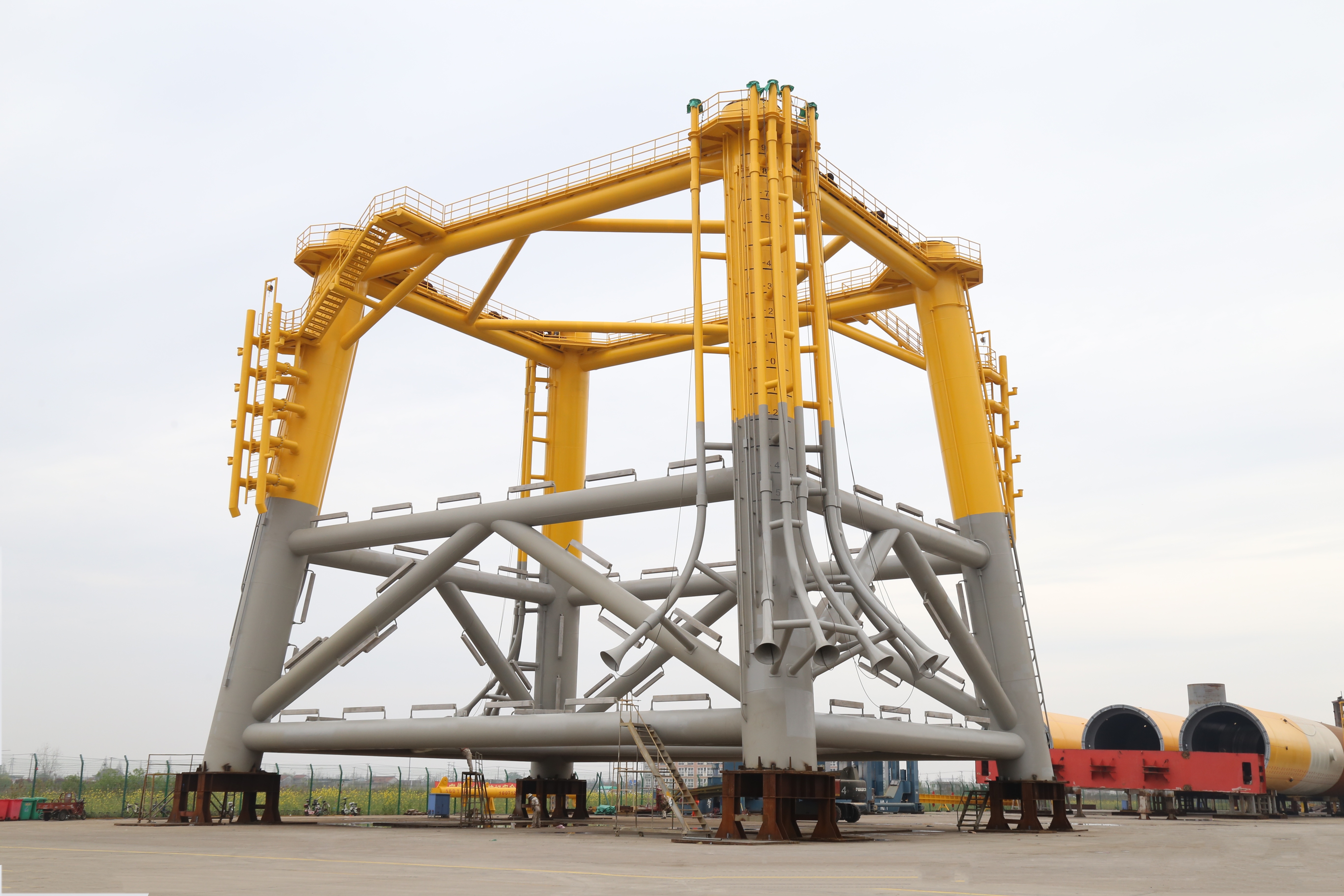 此次潤邦海洋承接天津南港海上風(fēng)電示范項目海上風(fēng)電基礎(chǔ)樁和海上升壓站導(dǎo)管架的建造任務(wù),海上風(fēng)電基礎(chǔ)樁直徑在7.5—8米,重量在1,200—1,300噸。海上升壓站導(dǎo)管架主要包括上部組塊和下部結(jié)構(gòu),上部組塊結(jié)構(gòu)采用框架-支撐體系,下部結(jié)構(gòu)采用導(dǎo)管架嵌套樁基礎(chǔ)型式。上下部結(jié)構(gòu)連接后形成多層空間整體桁架,有良好的剛度,更有利于水平荷載作用,增加結(jié)構(gòu)整體穩(wěn)定性。