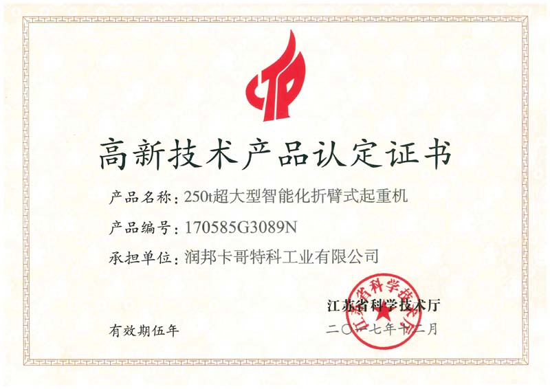 近日,由子公司潤邦卡哥特科研發的“250t超大型智能化折臂式起重機”項目再獲江蘇省科學技術廳高新技術產品認定證書。此項高新技術產品證書的獲得,是對潤邦卡哥特科科研創新能力的充分認可。潤邦卡哥特科將進一步提高自主創新能力,推進企業轉型升級。