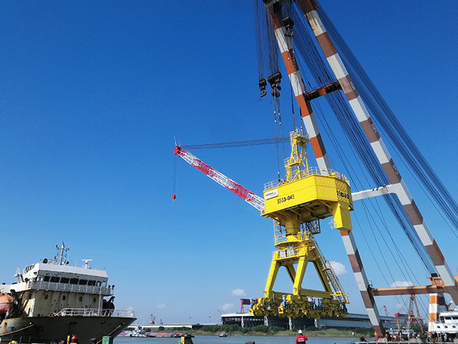 該產品安裝于70000t浮式船塢上,整機重約295噸,最大工作輪壓40000lbs,整機按照ABS起重設備規范及其它國際相關標準設計、制造和測試驗收。考慮到當地多臺風的氣候條件,此臺產品可抵擋最高18級超強臺風,完全滿足了高風速環境下的作業要求。