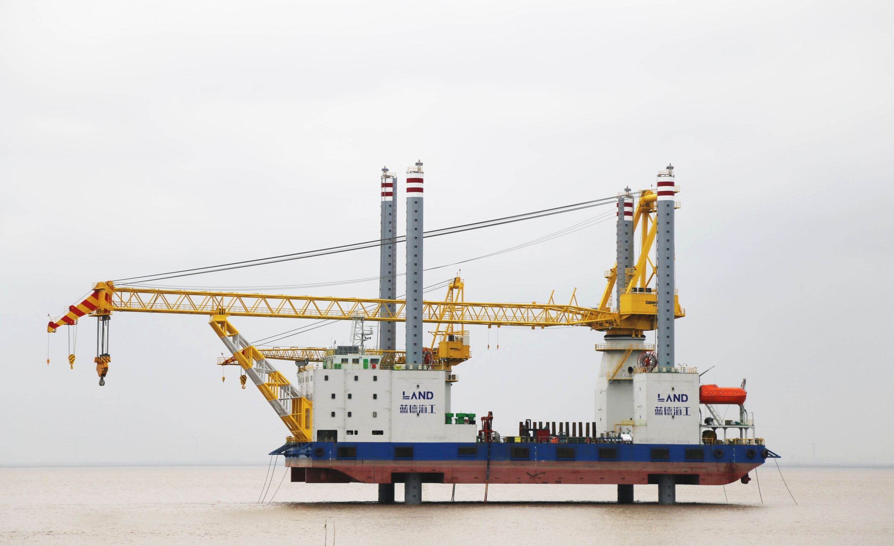 據(jù)悉,該平臺(tái)是一型集“風(fēng)電基礎(chǔ)施工、風(fēng)電塔筒、塔架、機(jī)艙、輪轂、葉片”安裝與維護(hù)為一體的風(fēng)電作業(yè)平臺(tái)。該平臺(tái)全長(zhǎng)120米、型長(zhǎng)78米、型寬38米、型深6.8米、吃水3.8米、艏部配置一臺(tái)600噸繞樁式全回轉(zhuǎn)起重機(jī)、最大吊高 110米;平臺(tái)左舷艉部配置一臺(tái)100噸的輔助吊機(jī),輔助吊機(jī)與主吊機(jī)配合作業(yè),可完成葉輪整體吊裝或其他需要翻身、維護(hù)的工作。