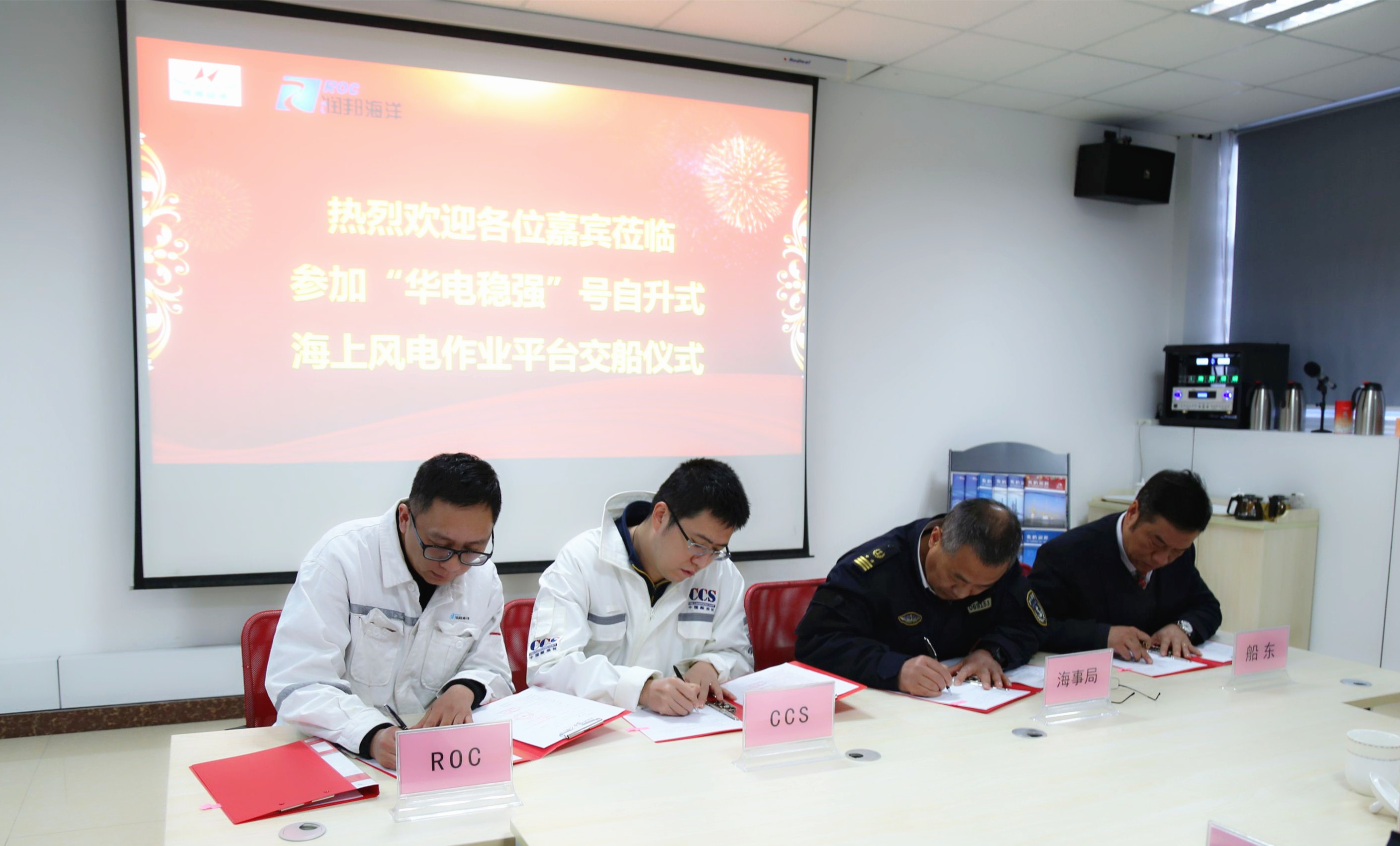 近日,南通潤邦海洋工程裝備有限公司為江蘇亨通藍德海洋工程有限公司(以下簡稱藍德公司)建造的“華電穩強”號自升式海上風電作業平臺在我司順利舉行交船儀式。