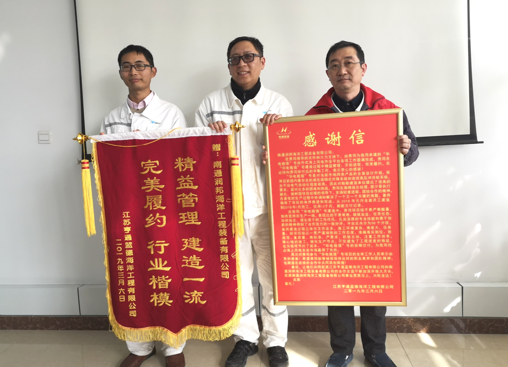 近日,潤邦海洋收到來自江蘇亨通藍德海洋工程有限公司送來的錦旗及感謝信。信中對潤邦海洋在“華電穩強”號自升式海上風電作業平臺建造過程中精益管理、開拓進取、完美履約給予高度的贊揚和衷心的感謝。