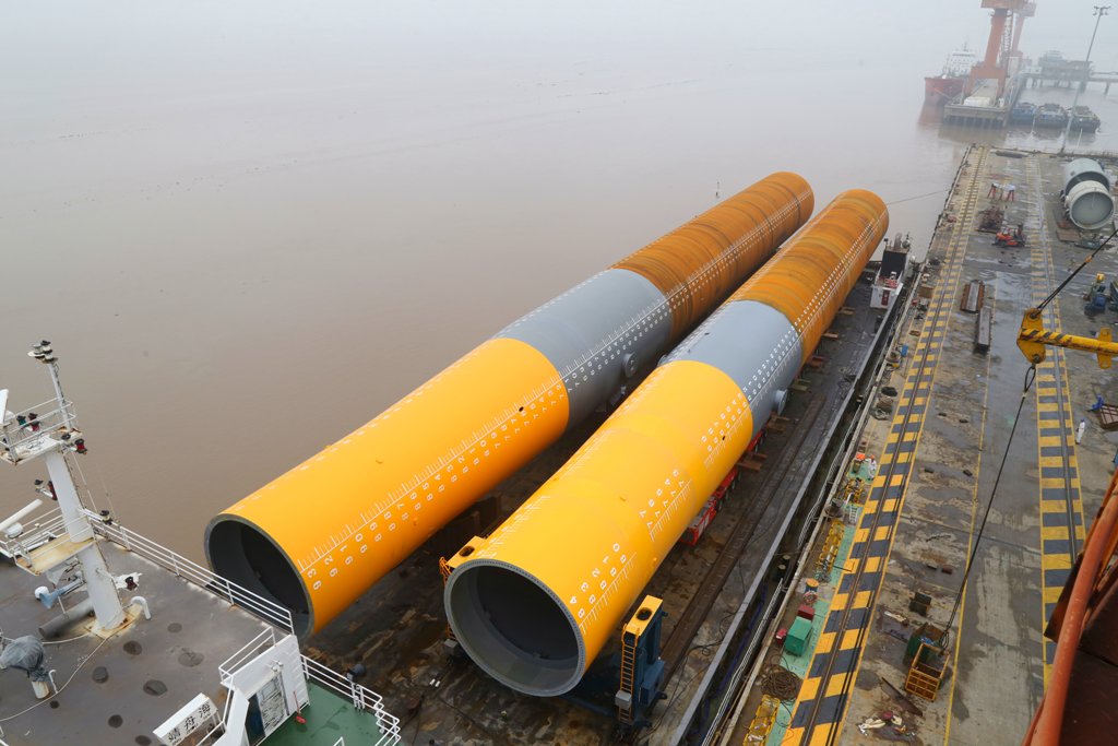 近日,潤(rùn)邦海洋承建的廣東粵電珠海金灣300MW海上風(fēng)電場(chǎng)的首制2根特大型鋼管樁順利裝船,單樁重量超過(guò)1400噸,直徑為8.4米,總長(zhǎng)近100米。