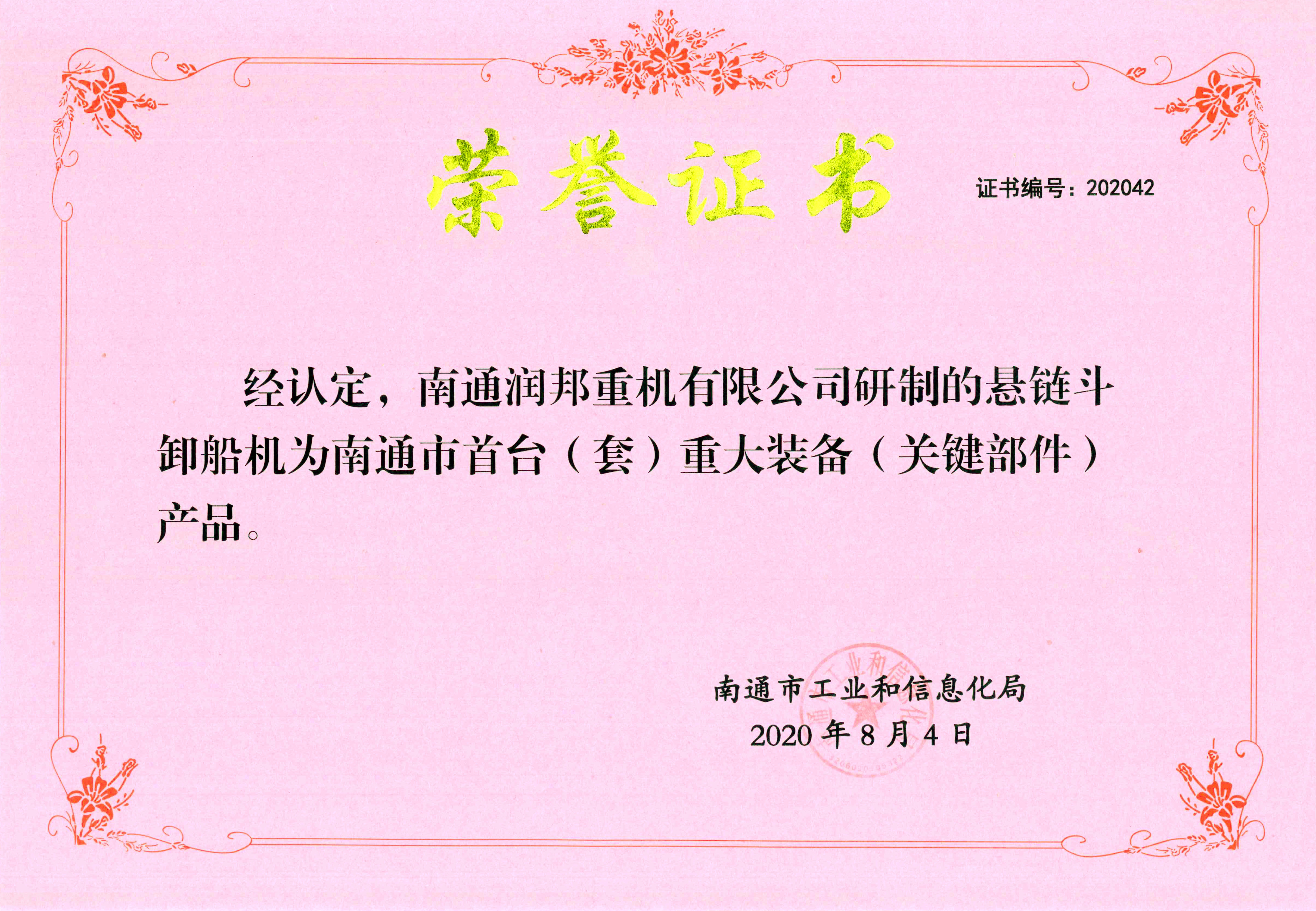 近日,公司自主品牌“GENMA”懸鏈斗卸船機(jī)被南通市工業(yè)和信息化局認(rèn)定為“南通市首臺(tái)(套)重大裝備(關(guān)鍵部件)產(chǎn)品”,該榮譽(yù)的取得充分體現(xiàn)了潤(rùn)邦重機(jī)在散料輸送作業(yè)方面的研發(fā)創(chuàng)新能力。