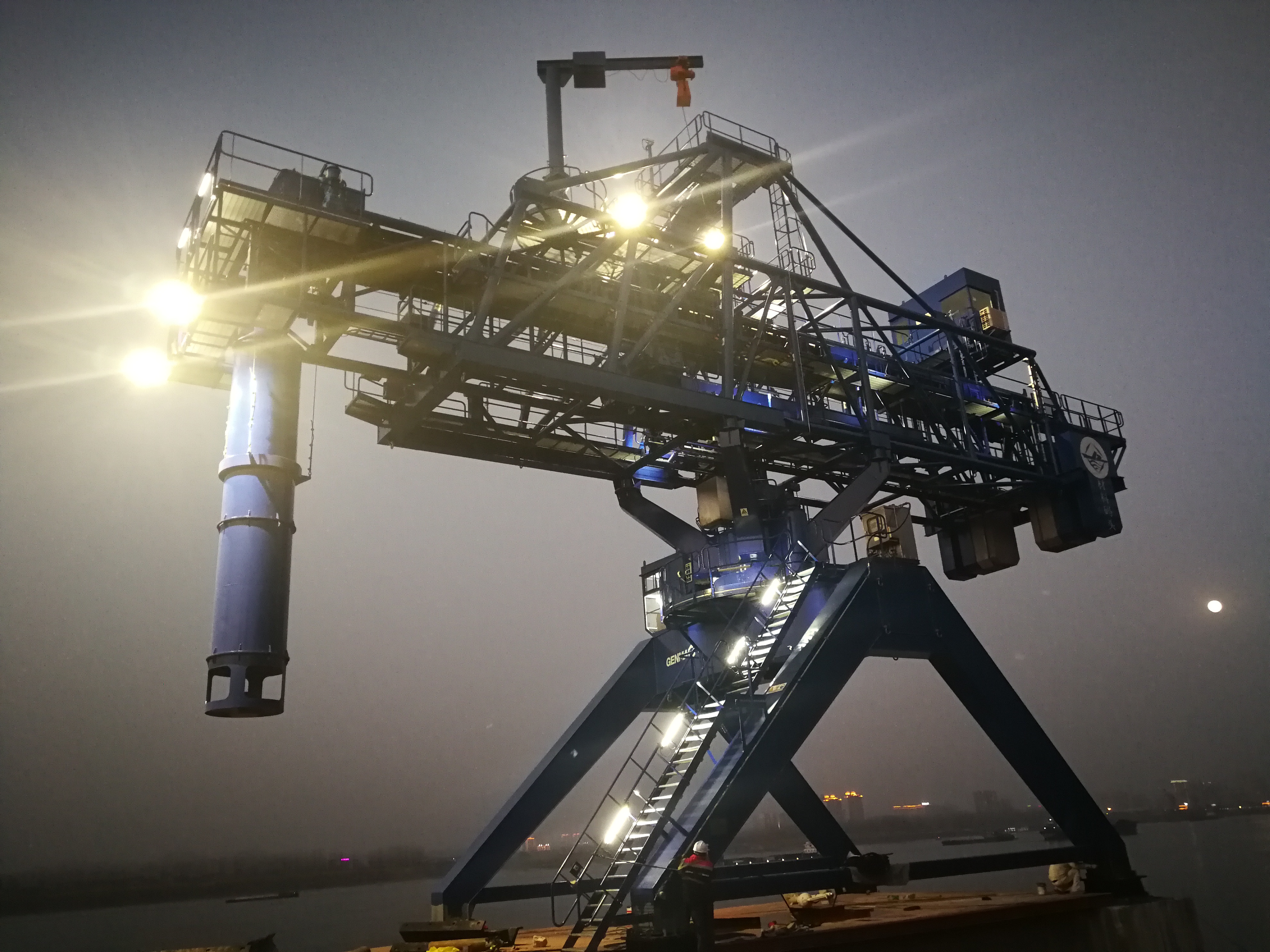 此次發運的GENMA裝船機額定作業效率為1000噸/小時,主要為客戶提供骨料、砂石等物料的裝船服務。設備采用伸縮溜筒特殊設計,滿足了長江不同水位高度下的裝船需求。設備溜筒頭部具備物料緩沖功能,有效避免了物料從高處下落對船體的沖擊。同時,該設備還設計有噴霧抑塵系統,減少了裝船作業過程中的粉塵污染。