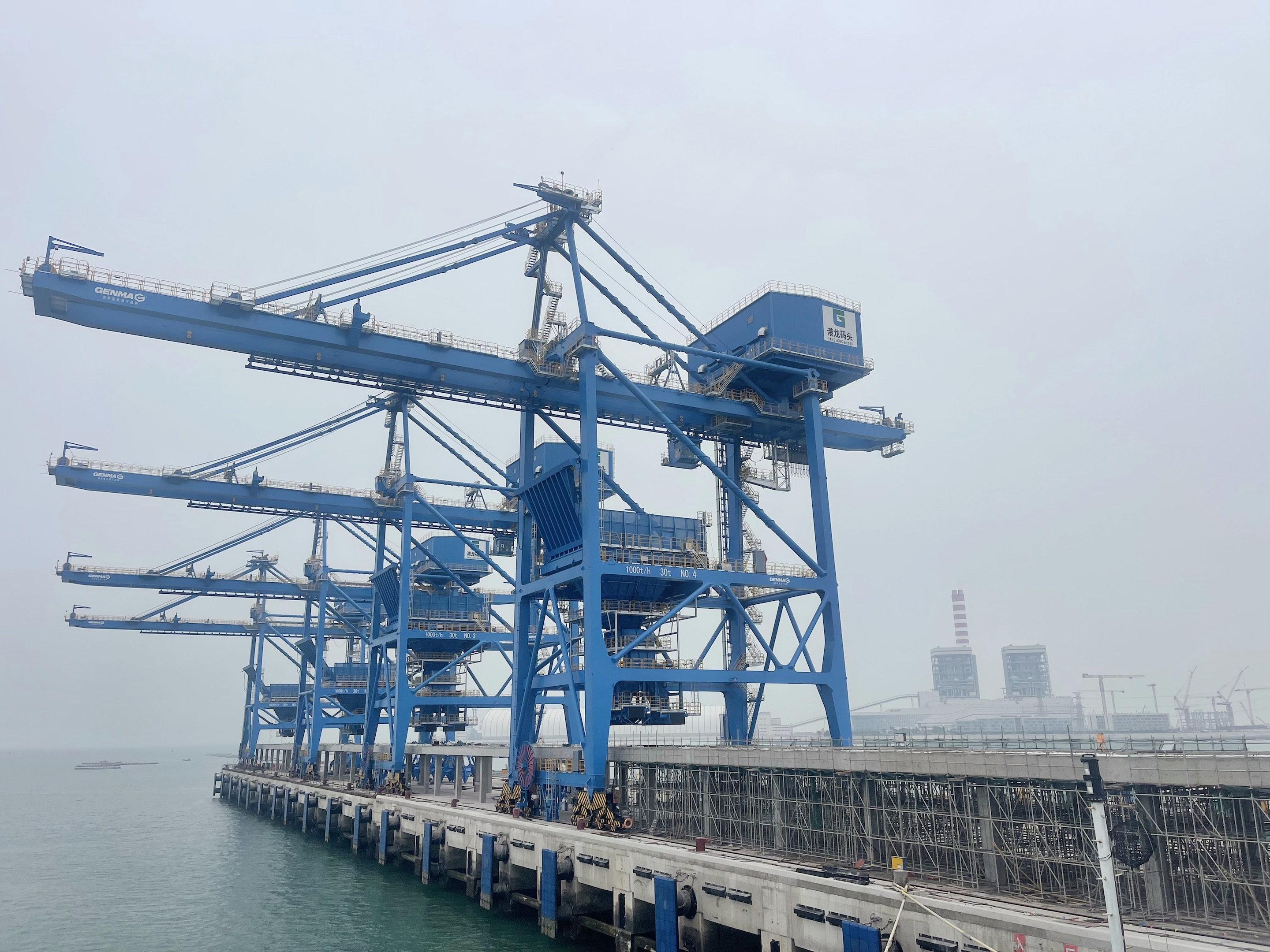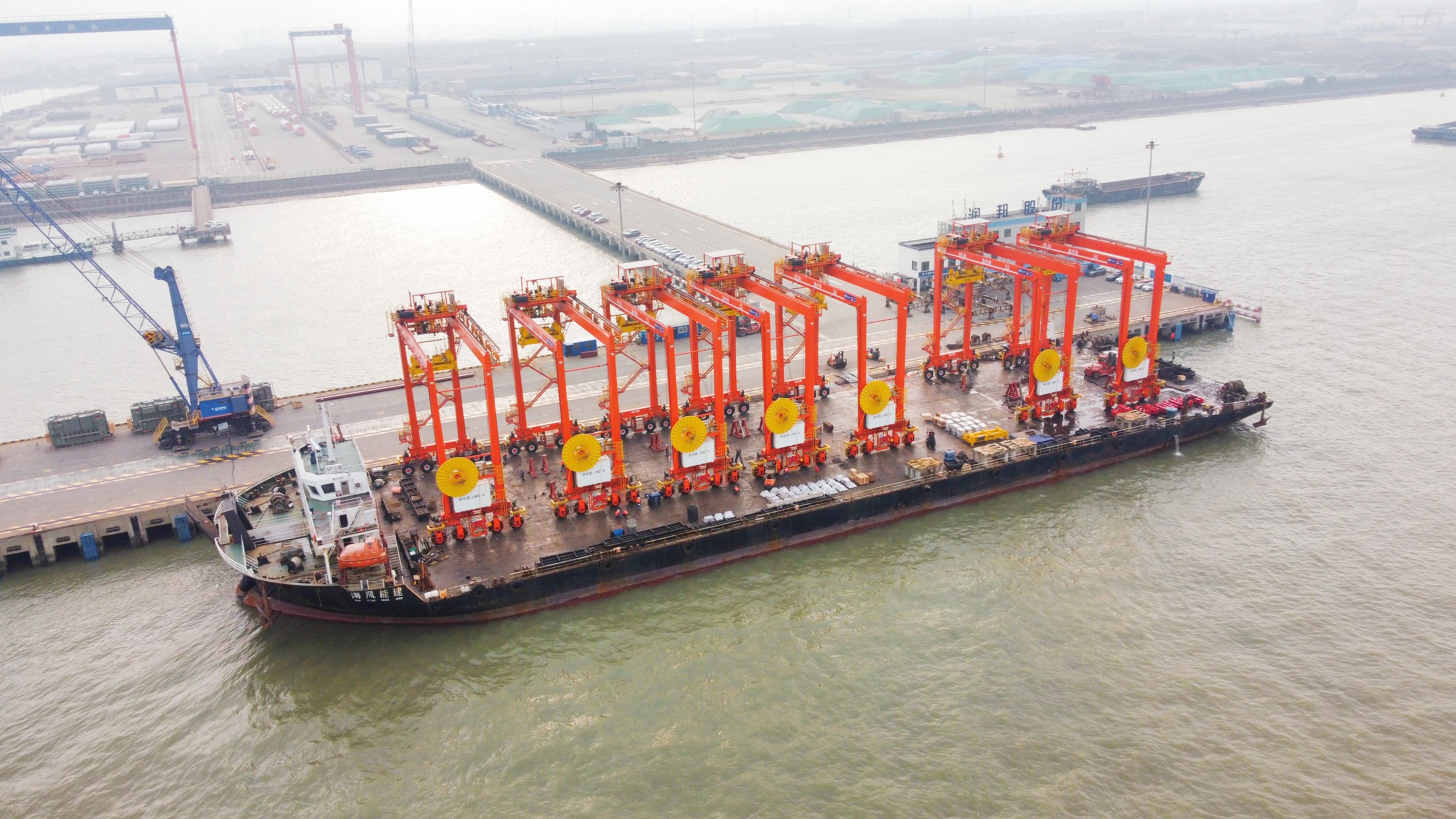 近日,子公司潤邦重機為造紙行業客戶再次提供的四臺GENMA橋式抓斗卸船機已順利落軌客戶碼頭。