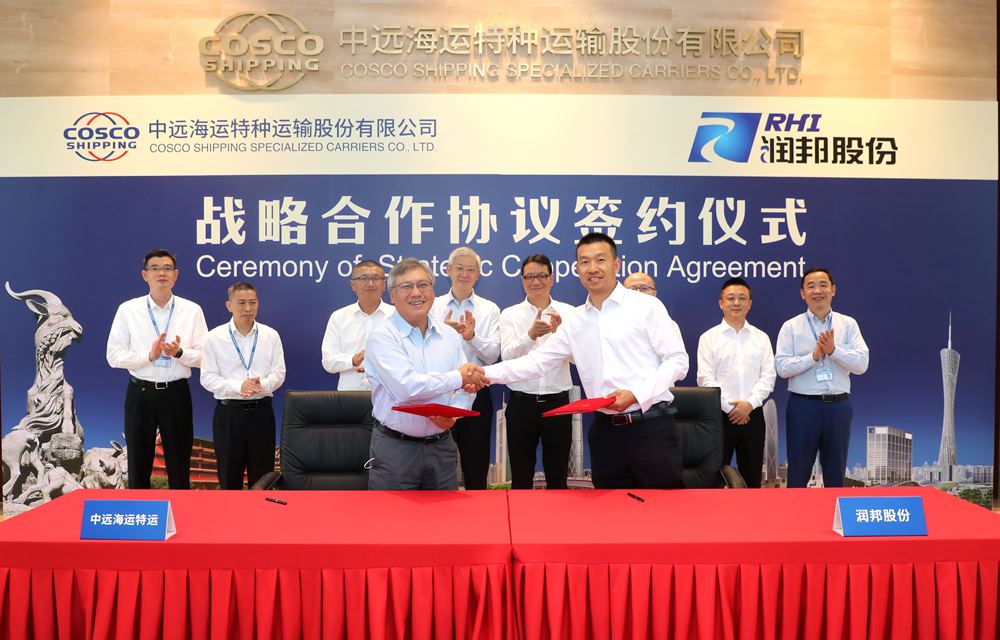 近日,潤邦股份與中遠海運特運簽署了戰(zhàn)略合作協(xié)議。中遠海運特運董事長、總經(jīng)理、黨委書記陳威,潤邦股份總裁吳建出席儀式并見證簽約,中遠海運特運總經(jīng)理助理顧衛(wèi)東、子公司潤邦工業(yè)副總經(jīng)理王澤民分別代表雙方簽字。