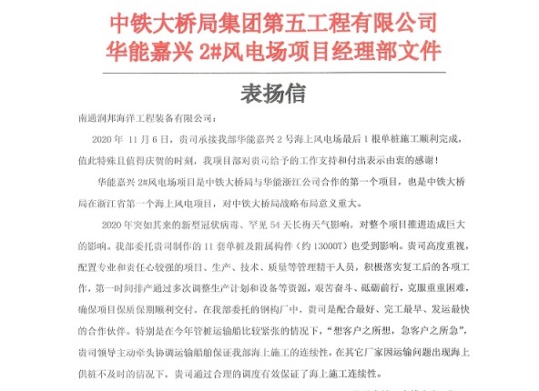 中鐵大橋局集團第五工程有限公司領導蒞臨潤邦海洋,特意送來“誠信立業、行穩致遠;專業高效、行業龍頭”的榮譽錦旗及感謝信,高度稱贊潤邦海洋在雙方合作的“華能嘉興2#風電場項目”上表現出的頑強拼搏、精益制造的生產服務理念。公司常...