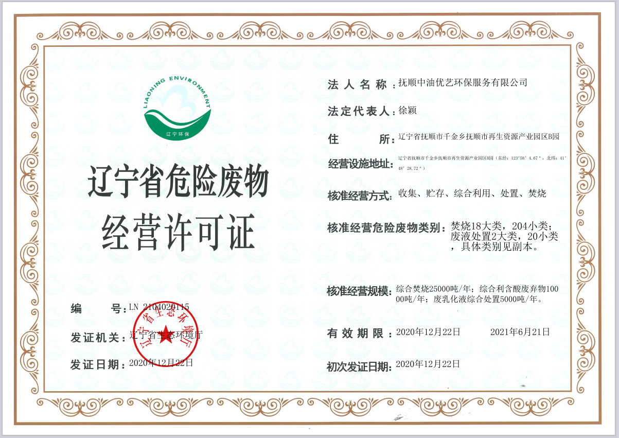 近日,潤邦股份旗下中油環保撫順公司取得遼寧省危險廢物經營許可證(證書編號:LN2104020115)。核準經營規模為綜合焚燒2.5萬噸/年、綜合利用含酸廢棄物1萬噸/年、廢乳化液綜合處置0.5萬噸/年。