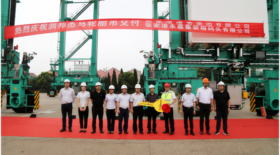 近日,潤邦工業張家港項目3臺輪胎吊交付給張家港港務集團有限公司,1臺輪胎吊交付給張家港港務集團旗下張家港永嘉集裝箱碼頭有限公司的交機儀式圓滿舉行,公司及港務集團、永嘉碼頭相關領導出席了儀式。