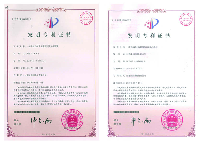 近期,潤邦重機獲得了由國家知識產權局授權的兩項發明專利證書,分別為“一種繞樁式起重機新型回轉支承裝置”和“一種非公路工程機械的底盤懸掛系統”,標志著公司在海洋工程裝備和港口機械領域取得了新的技術突破。