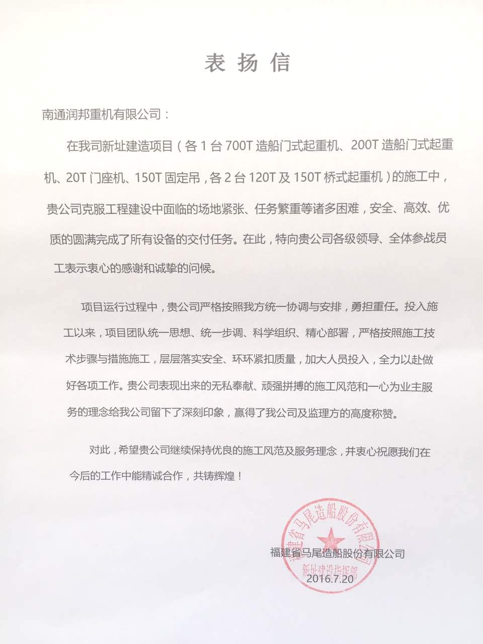 近日,潤邦重機再次收到由福建省馬尾造船股份有限公司寄來的表揚信,信中就潤邦重機順利交付的“杰馬”品牌700t造船門式起重機、門座式起重機、橋式起重機等產品性能和質量表示了認可,并對“杰馬”團隊在履約過程中的專業技能和敬業精神...