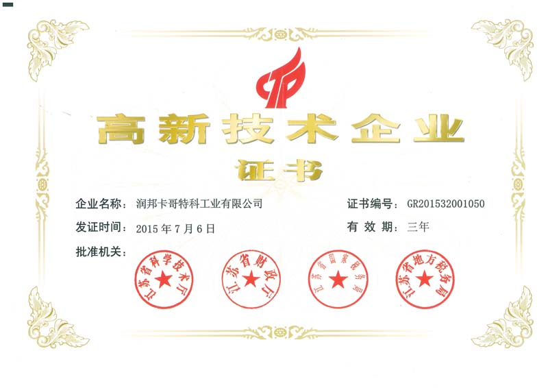 近日,潤邦卡哥特科獲得由江蘇省科學技術廳、江蘇省財政廳、江蘇省國家稅務局、江蘇省地方稅務局聯合頒發的《高新技術企業》證書。
