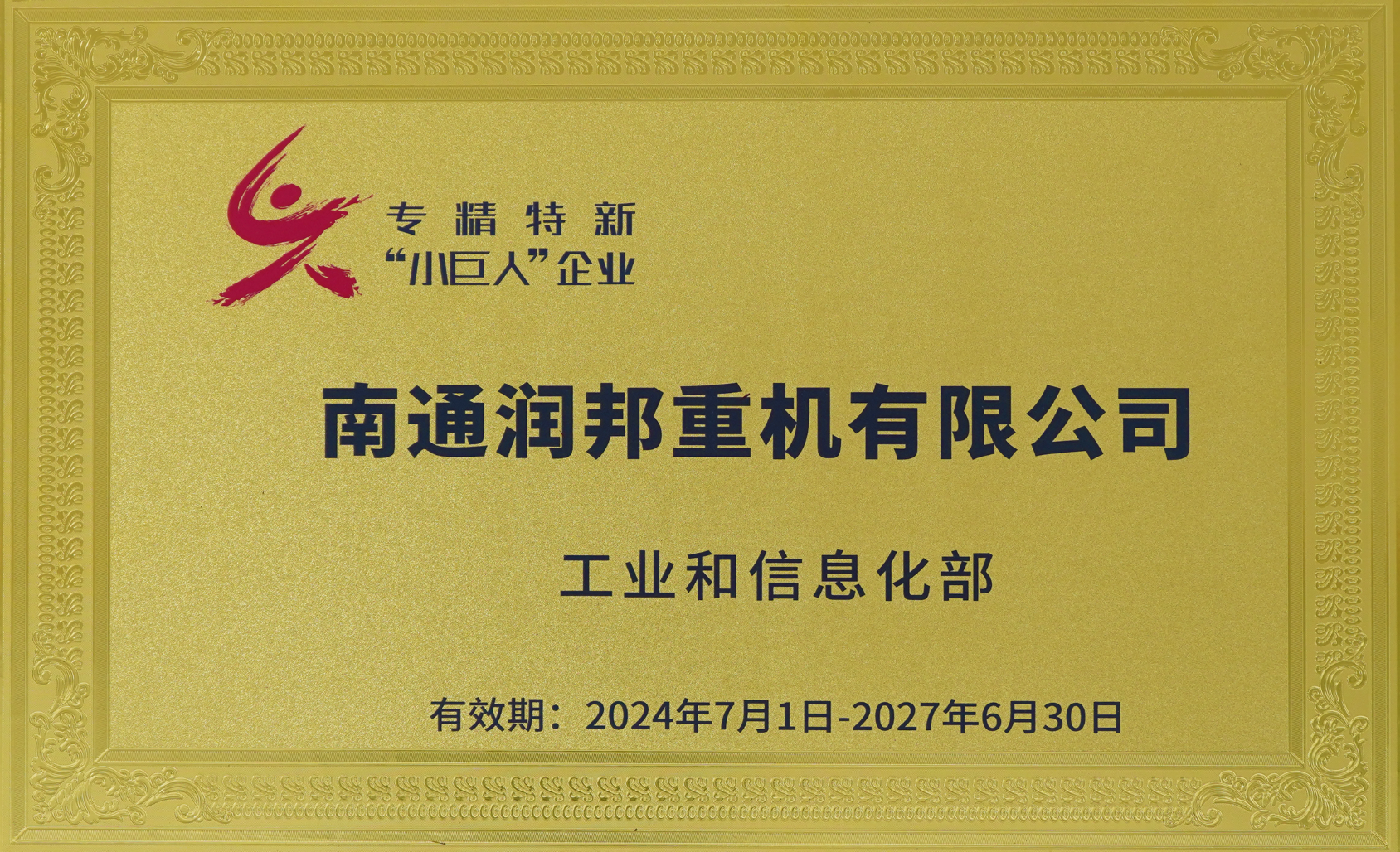 去年9月,在國家工業和信息化部組織開展的第六批專精特新“小巨人”企業培育認定和審核工作中,子公司潤邦重機成功通過審核獲評國家級專精特新“小巨人”企業。近日,潤邦重機收到了專精特新“小巨人”企業稱號的證書。