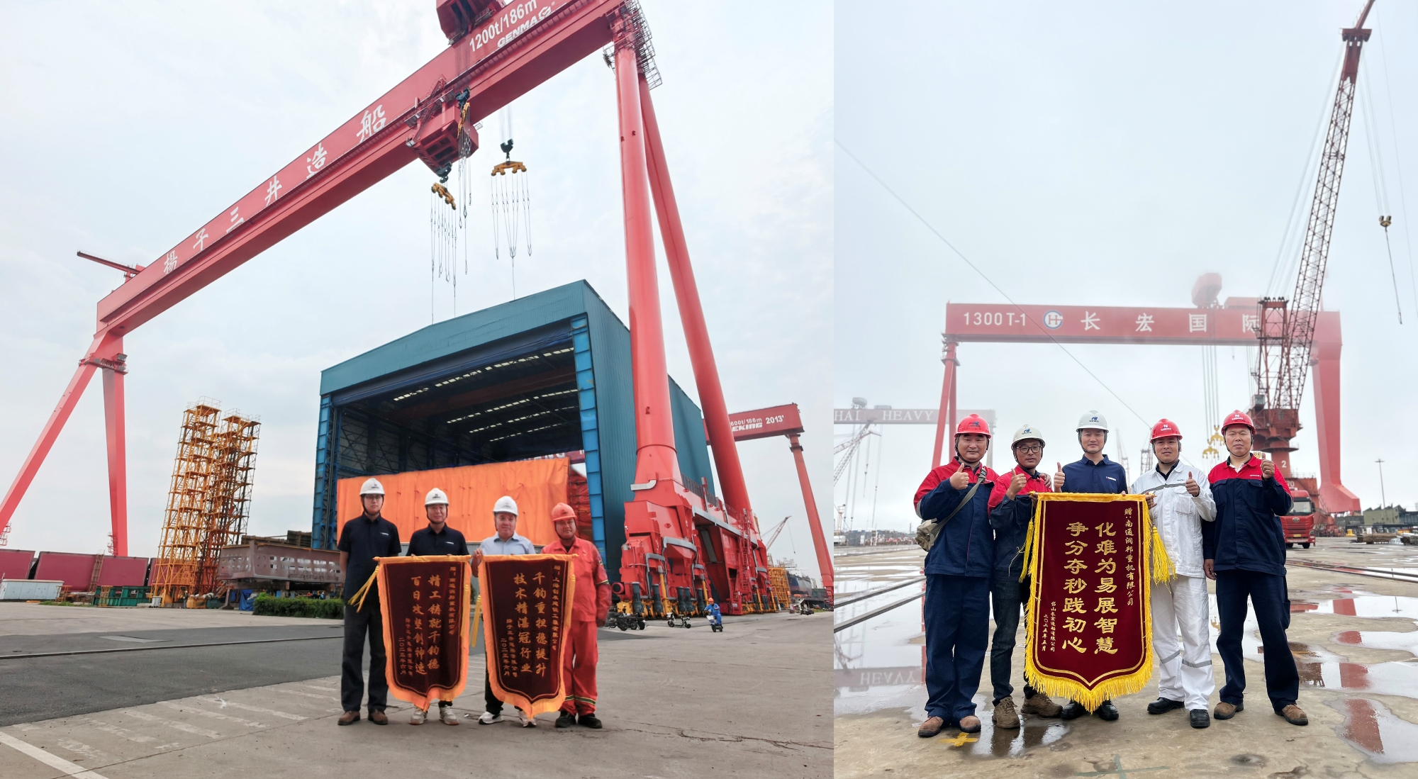 近日,GENMA相繼交付行業客戶一臺 1,200 噸及一臺 1,300 噸門式起重機,并憑借高效的項目執行能力贏得客戶高度認可,分別收獲客戶贈予的“精工鑄就千鈞穩,百日攻堅創神速”“化難為易展智慧,爭分奪秒踐初心”兩面榮譽錦旗。