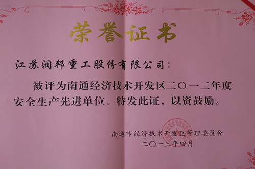近日,江蘇潤邦重工股份有限公司被南通經濟技術開發區管理委員會評為“二0一二年度安全生產先進單位”。