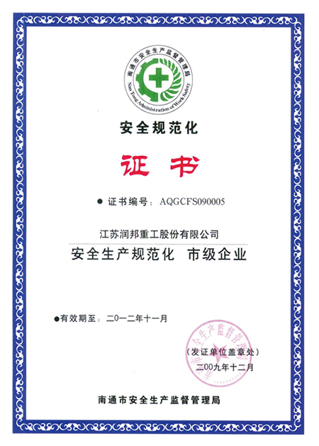 2011年7月13日,南京海關、南通海關在位于市區青年西路的海關大廈會議廳聯合舉辦了“南京海關AA類企業(南通)授牌儀式”,江蘇潤邦重工股份有限公司獲“AA類企業”授牌。