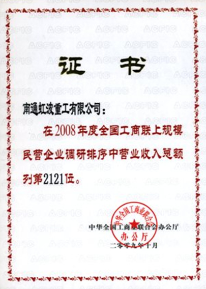 江蘇潤邦重工股份有限公司在08年度全國工商聯(lián)上規(guī)模民營企業(yè)調(diào)研排序中營業(yè)收入總額列第2121位,比07年度排名上升了69位。這項(xiàng)調(diào)研由中華全國工商業(yè)聯(lián)合會辦公廳主辦,是企業(yè)在全國綜合實(shí)力體現(xiàn)的重要依據(jù)。
